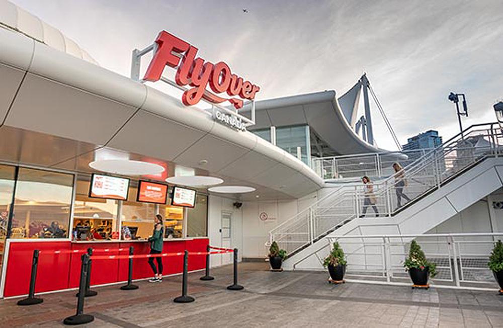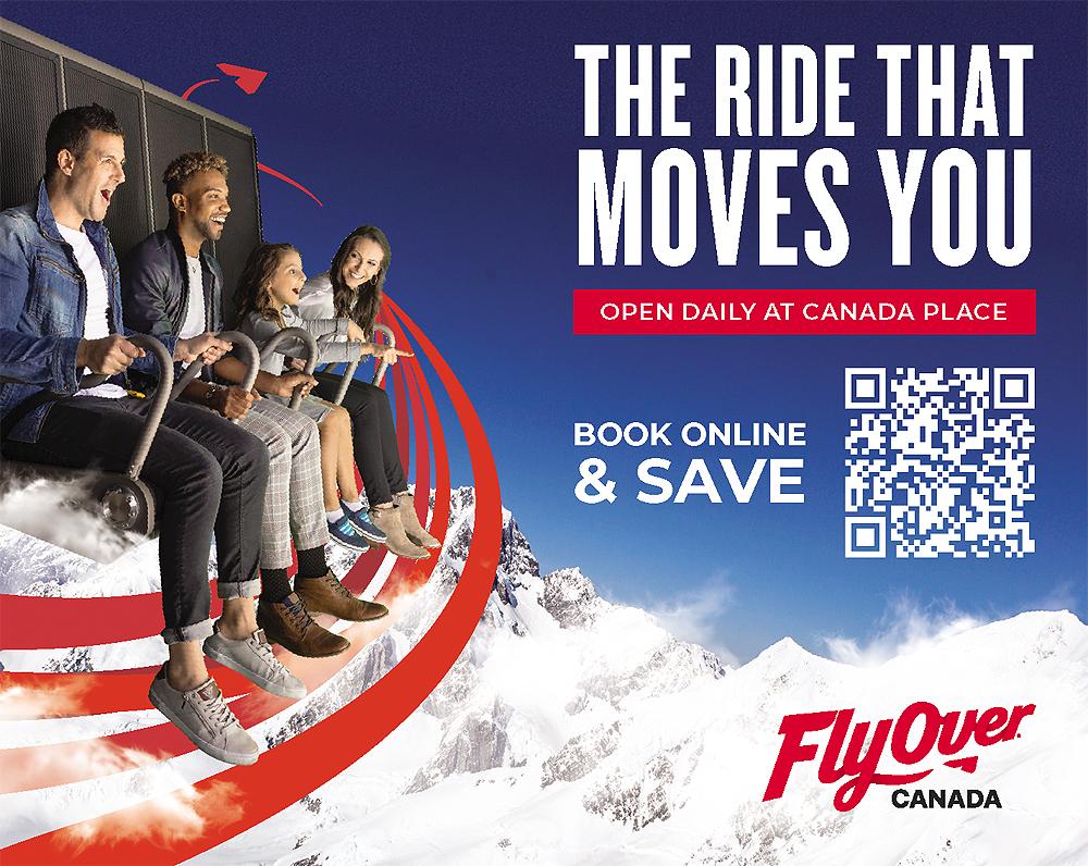 FlyOver Canada utilizes state-of-the-art technology to give you the feeling of flight. You will hang suspended, feet dangling, before a 20-metre spherical screen while our film whisks you away on an exhilarating 8-minute journey across Canada, from east to west. Special effects, including wind, mist and scents, combine with the ride’s motion to create an unforgetable experience.